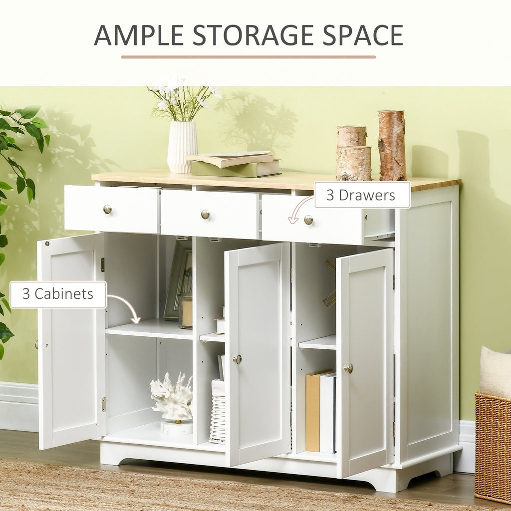 Modern Sideboard Buffet with Rubberwood Top, Buffet Cabinet with 3 Drawers, 3 Cabinets and Adjustable Shelves for Kitchen, Buffet Table, White