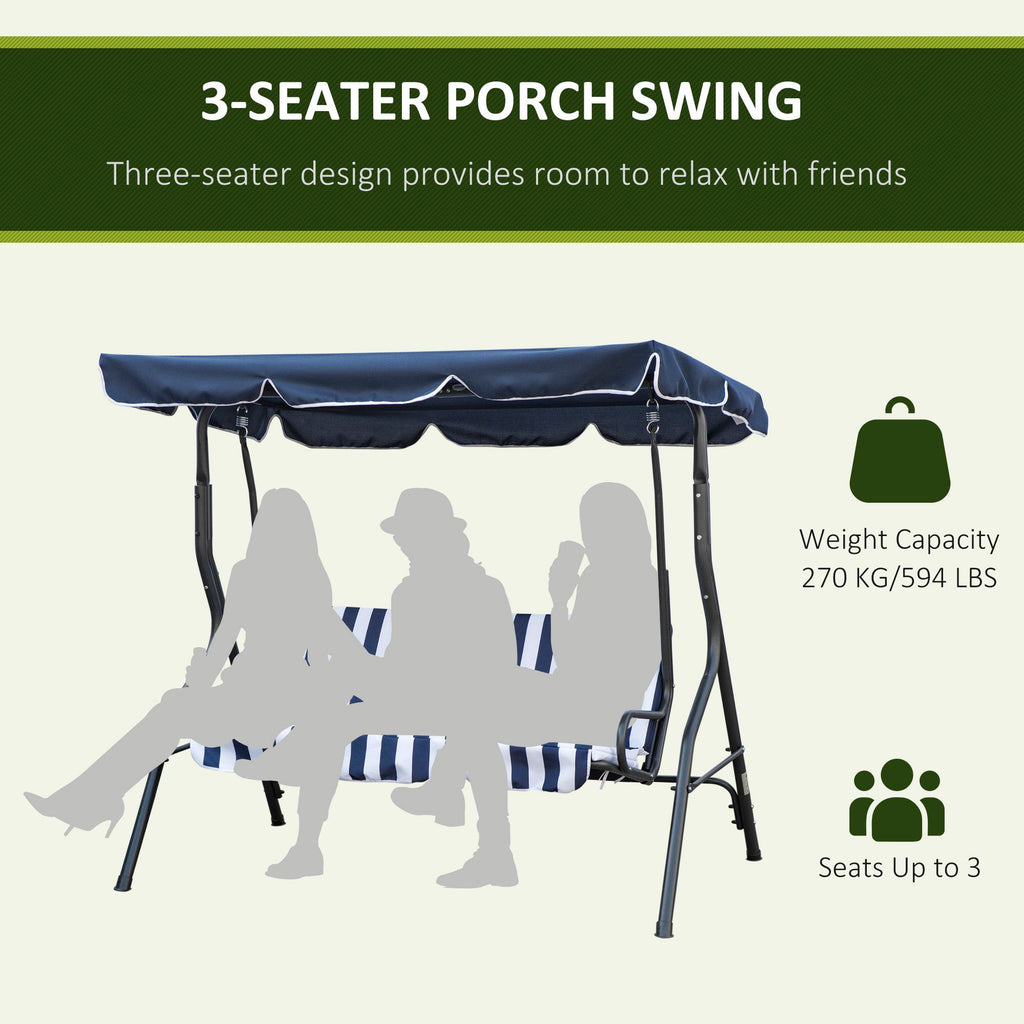 3-Person Patio Porch Swing with Adjustable Canopy for Adults, Steel Frame, Seat & Backrest Cushion, Armrests, Dark Blue & White Striped