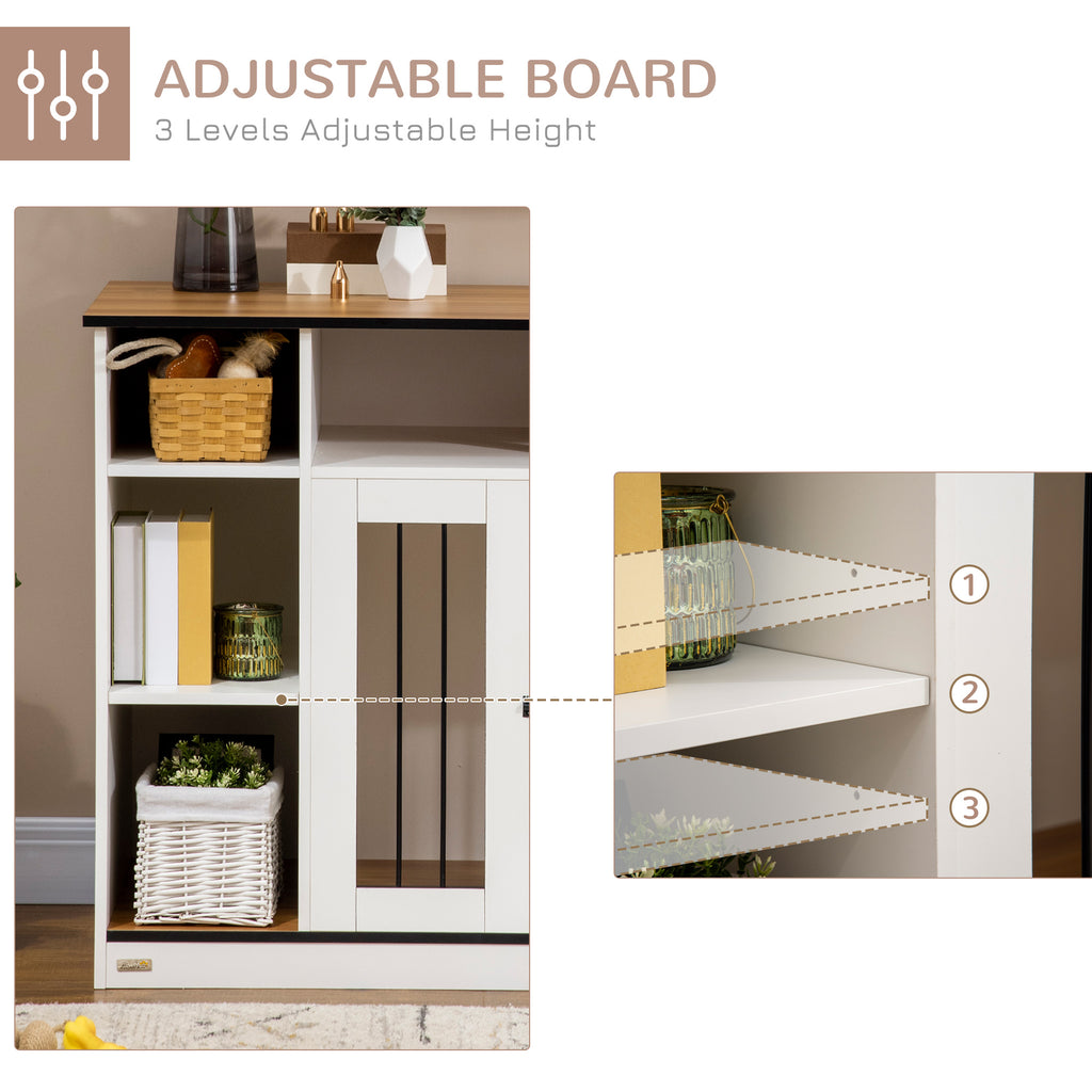 - - Open Shelves: Featuring an end table design with three small shelves and one big shelf, this dog kennel furniture offers a large amount of storage underneath for fitting more inside.