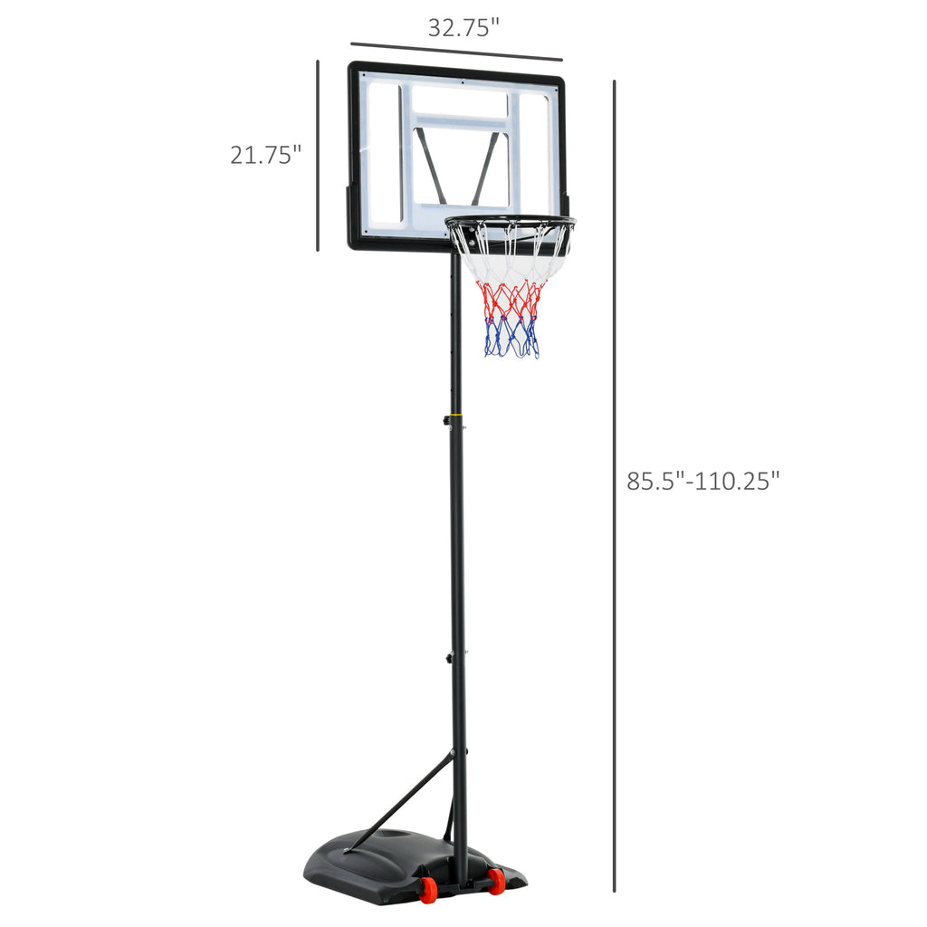 - - BASKETBALL HOOP INFORMATION: Backboard Dimensions: 32.75"W x 21.75"H, Adjustable Height: 85.5"-110.25", Basketball Hoop Height: 65.75"-90.5", Base Dimension: 32.75"L x 21.75"W x 5.5"H. Assembly required
