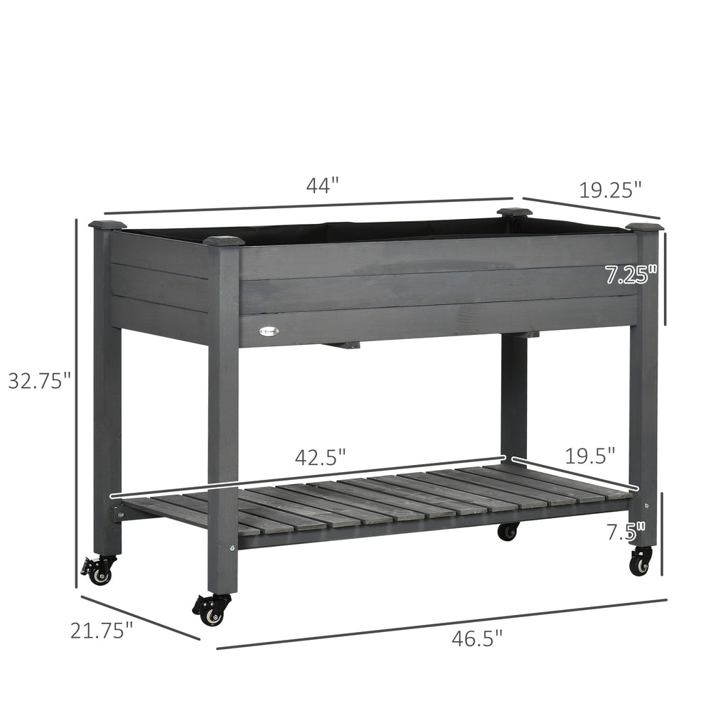 47" x 21" Raised Garden Bed Elevated Wooden Planter Box w/ Lockable Wheels, Storage Shelf for Backyard, Dark Gray