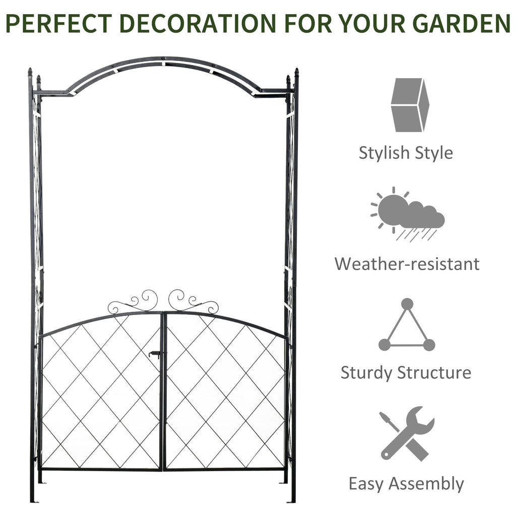 85'' Metal Garden Arbor with Gate, Outdoor Steel Arch with Scrollwork for Climbing Vines, Ground Mountable Columns